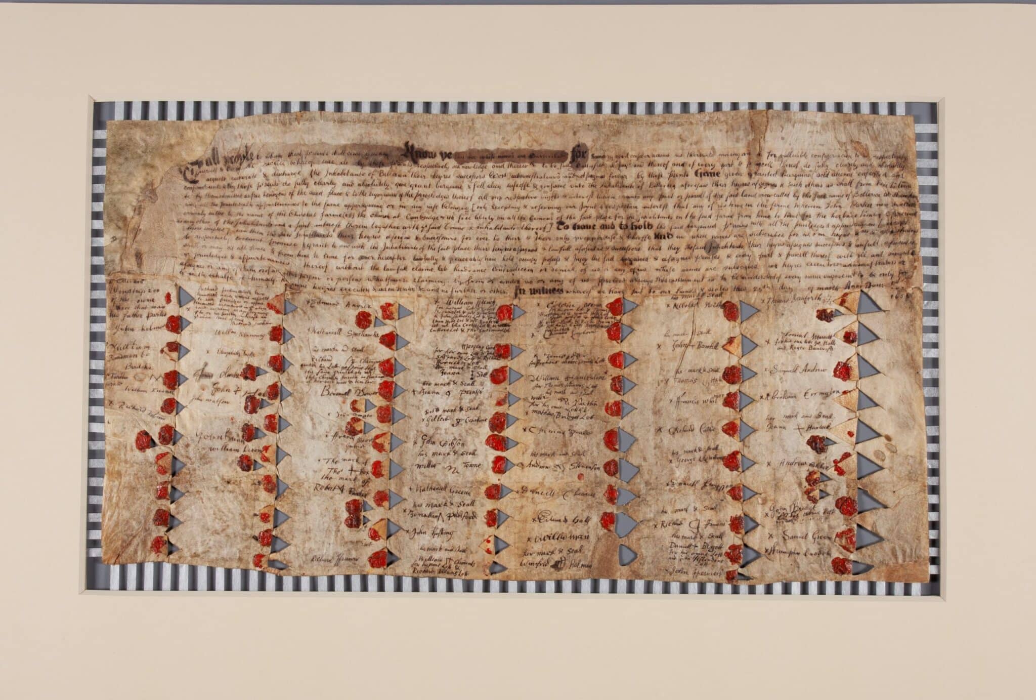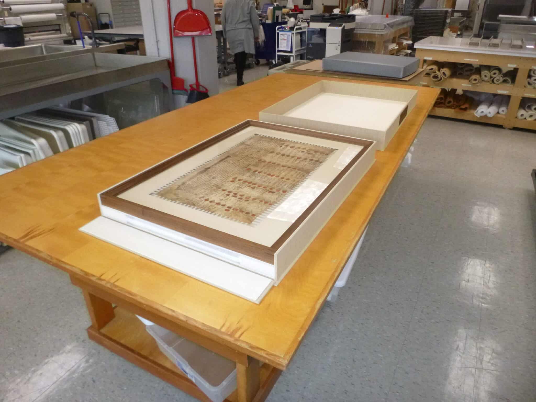 To read about the Great Deed’s full preservation story and see more photographs, visit: https://www.nedcc.org/about/nedcc-stories/billerica-deed Framed: New Archival Housing: Great Deed Recto: Great Deed Verso: