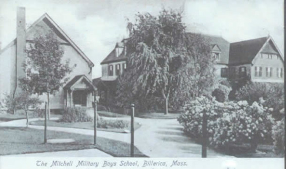 The Mitchell Military Boys School was opened in Billerica in 1879 by Professor Moses C. Mitchell, an 1862 graduate of Waterville College, now Colby, in Waterville, Maine. Professor Mitchell had taught at a number of academies in Maine before becoming proprietor of a private boy’s school in Edgartown, MA. After eleven years on Martha’s Vineyard, he moved his school to its impressive location on the corner of Andover Road and Boston Road in Billerica. Initial enrollment was limited to twenty-four residential students but that number soon grew. Tuition was $400 per year at this time and thirty years later, in 1909, it was $600 plus approximately $75 in mandatory expenses. By 1929 the cost of the school had climbed to about $1300.